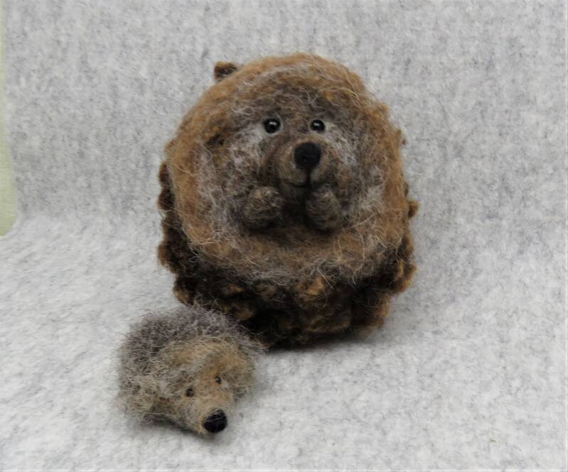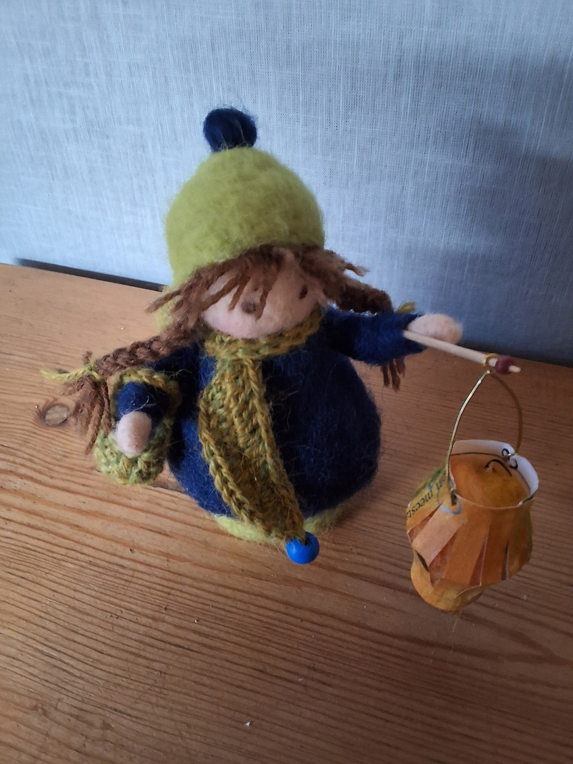 Een naaldviltpopje, een Pietje met klompje en gevilte worteltjes.