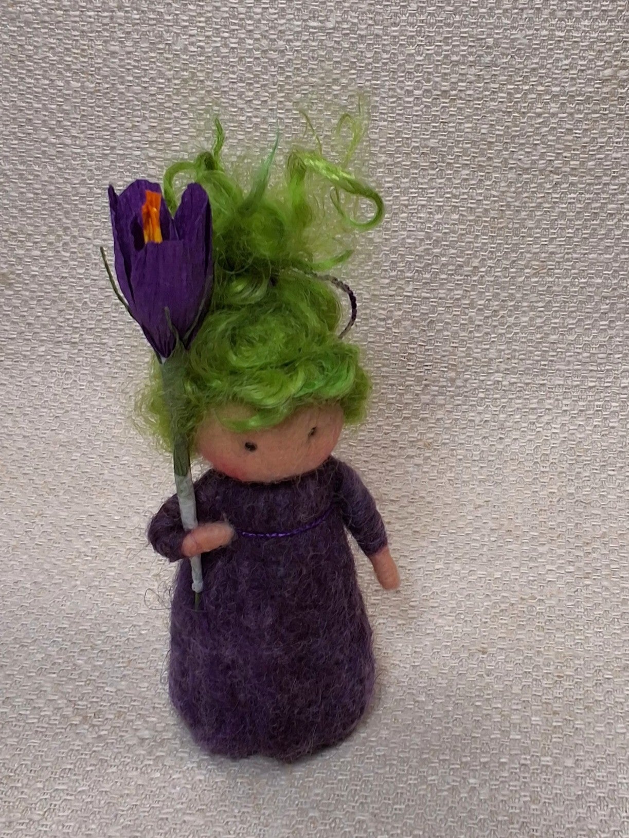 Naaldviltpopje Crocus met handgekaard gemeleerd rokje.