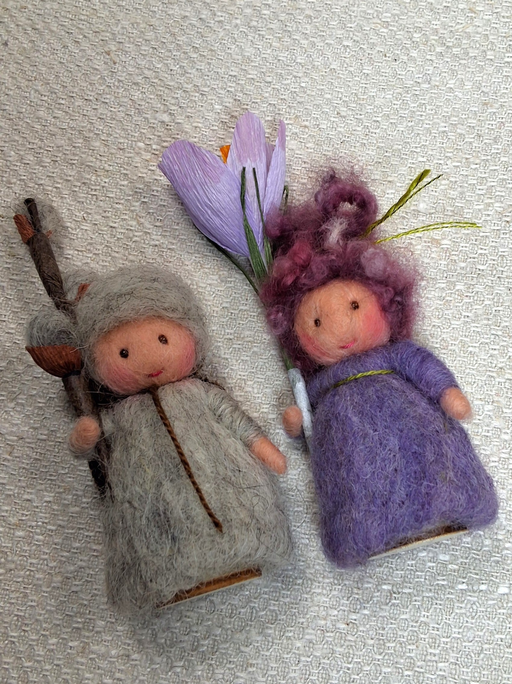 Naaldviltpopje Mini wilgenkatje met takje wilgenkatjes en Crocus met crocus van papier..Figuurtjes zijn ongeveer 7cm hoog.