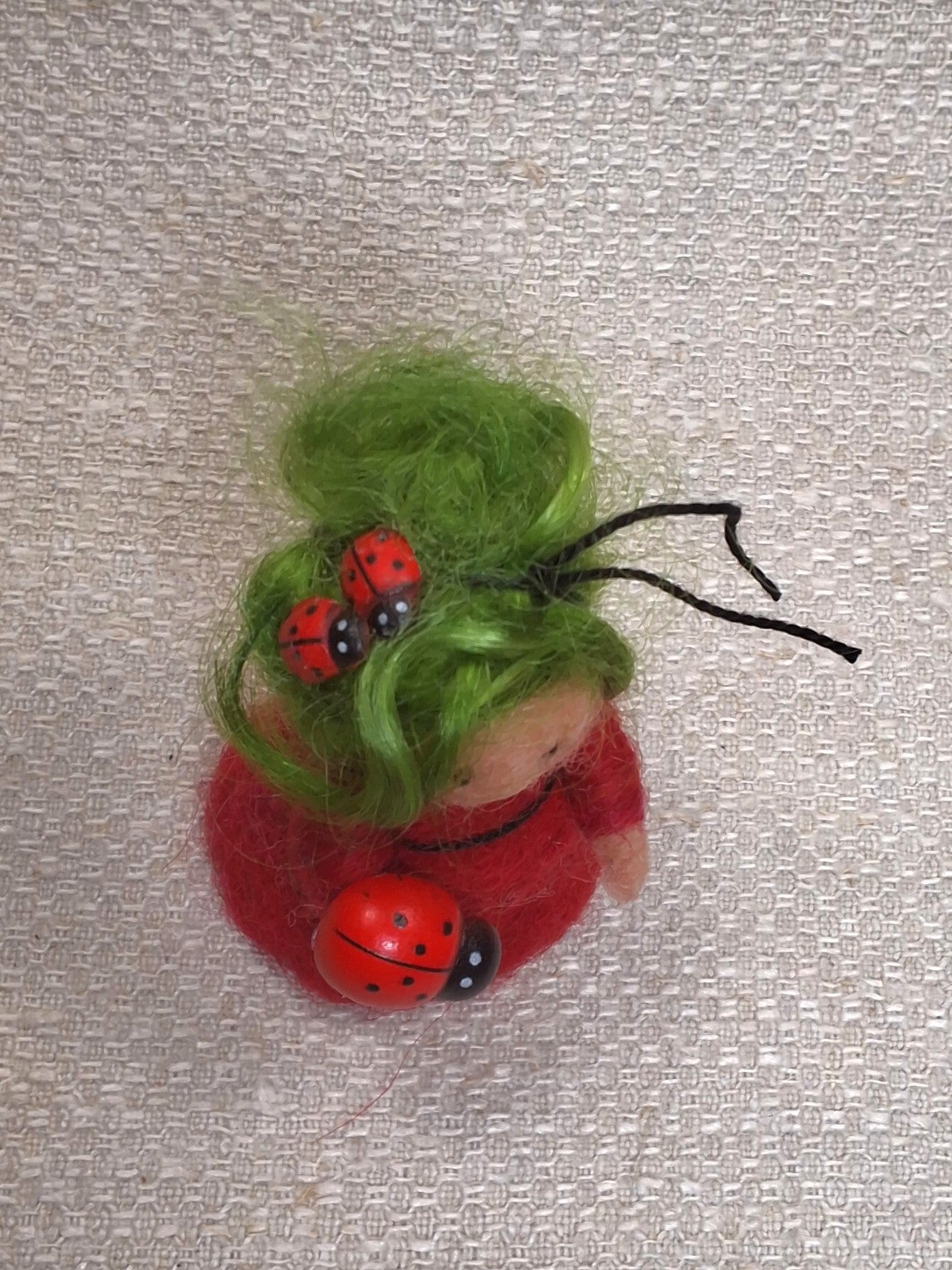 Naaldviltpopje Mini met Lieveheersbeestjes.Figuurtje is ongeveer 7cm hoog.