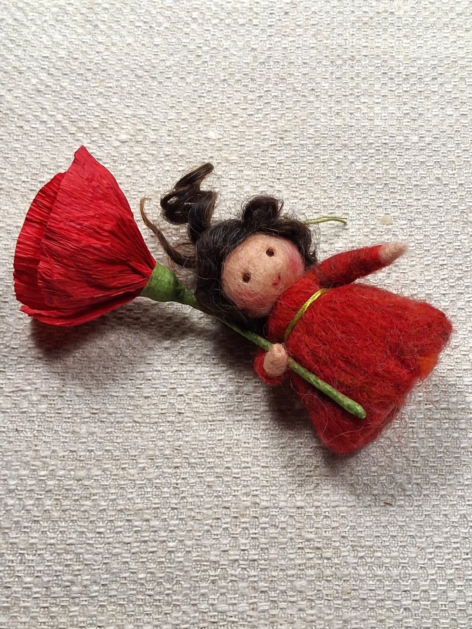 Naaldviltpopje Mini met Klaproos van papier.Figuurtje is ongeveer 7cm hoog.