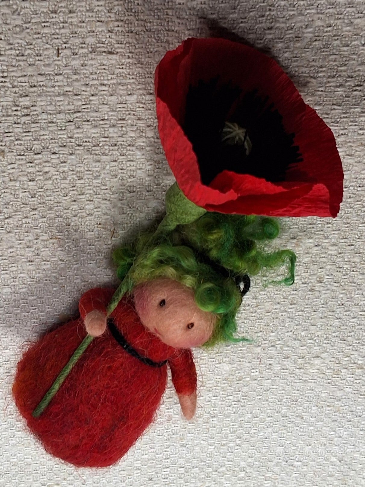 Naaldviltpopje Mini met Klaproos van papier.