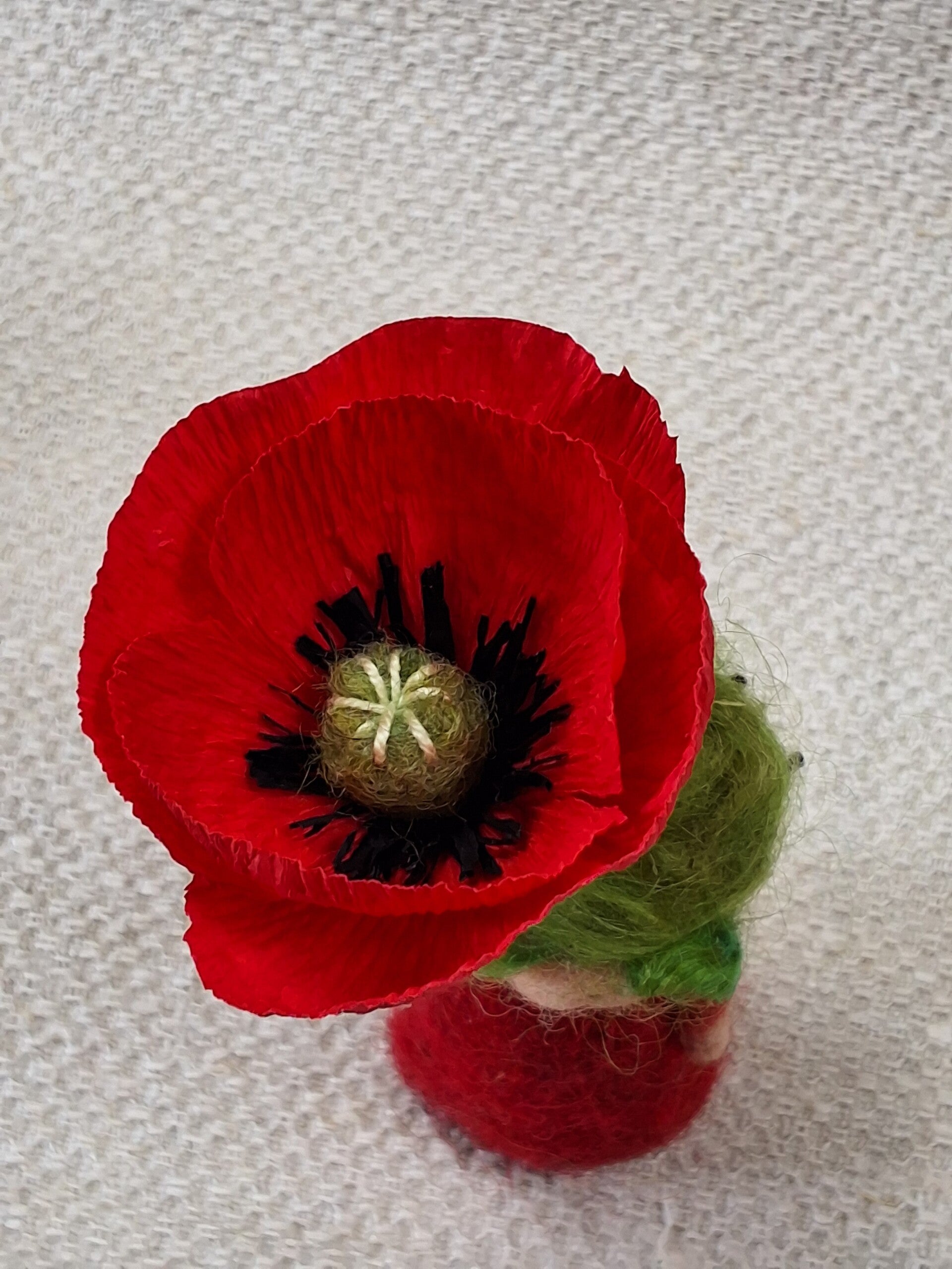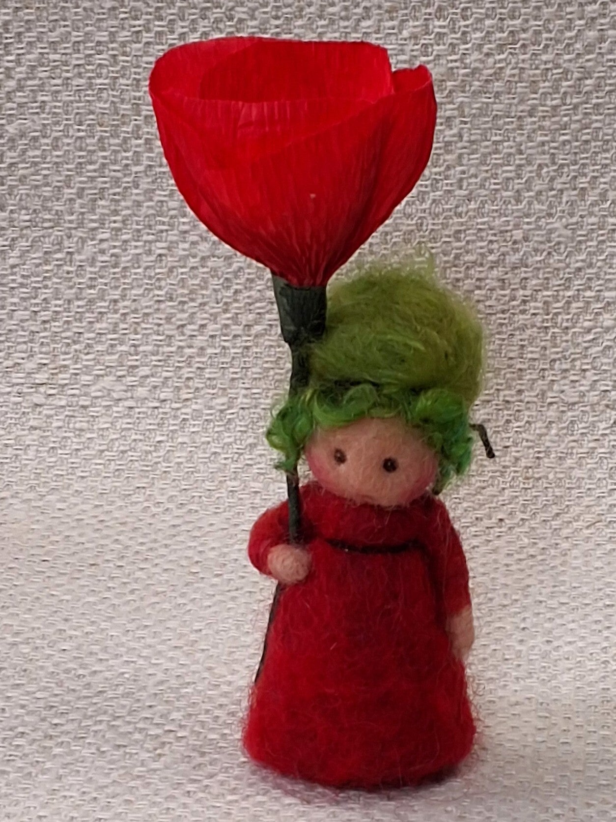 Naaldviltpopje Mini met Klaproos van papier.Figuurtje is ongeveer 7cm hoog.
